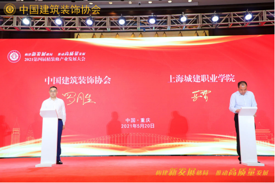 ▲ 中国建建粉饰协会全拆修财产分会秘书长罗胜取上海城建职业学院建建取艺术学院院长高守雷签订计谋合做。