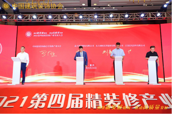 ▲中国建建粉饰协会全拆修财产分会罗胜秘书长代表协会取渝丰科技股份无限公司总司理曾令果、东方雨虹平易近用建材无限义务公司工拆事业部总司理刘亮亮、江苏晨曦涂料无限公司董事长缪国元签约计谋合做。